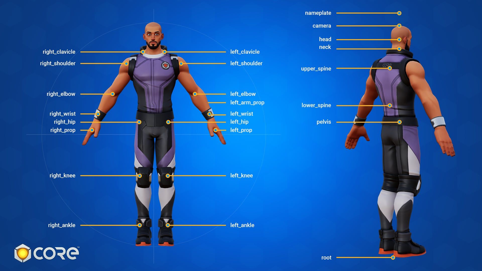 Core has built-in animations and stances that can be applied to the player's character and animated meshes. Importing animations is not supported, but custom animations can be created for the player's character by using IK Anchors.