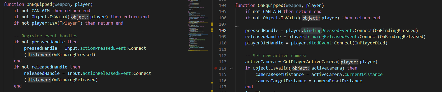For example, below is a comparison between the WeaponAimClient script that is used in some Core Content weapons and the same script that is used in older Community Content.