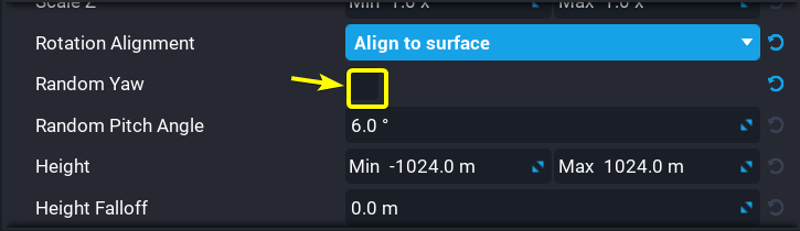 The Random Yaw property determines if the foliage objects should be randomly rotated around their local z-axis.