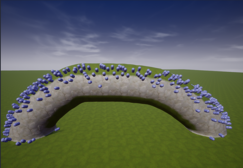 The Ground Slope Angle controls the type of slope the foliage is allowed to spawn on. Ground Slope Angle can be used to prevent foliage like trees from spawning on the side of a cliffs. The Group Slope Angle property has two settings. The first setting is the minimum slope angle. The second setting is the maximum slope angle. The table below demonstrates how manipulating the first and second settings for the Ground Slop Angle property changes the locations that foliage spawns at.
