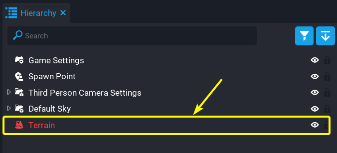 terrain creator icon at the top of the Core Editor to open the TERRAIN CREATOR drop down menu.