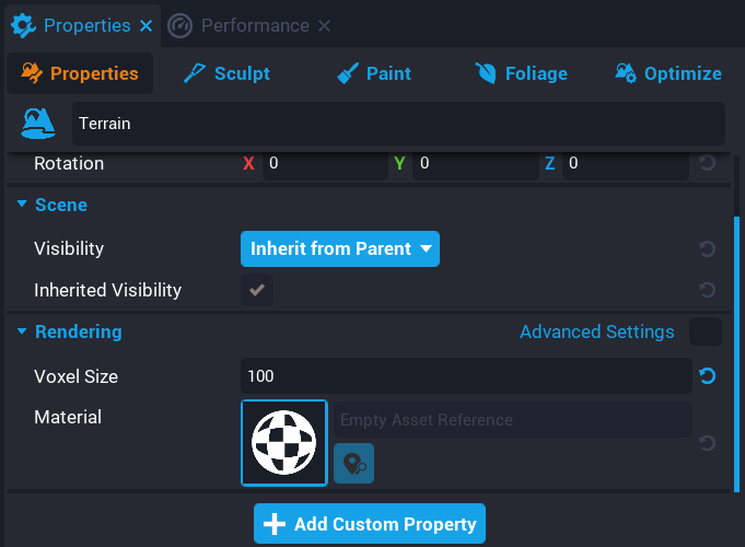 The General section contains settings that will apply to all types of terrain. The Voxel Size setting determines how large the voxels of the terrain will be. A voxel is like a 3D pixel. The smaller the voxels are, the more detail the terrain can have. The Terrain Size setting determines how many voxels the terrain will have. The higher the voxel count, the larger the terrain can be. The downside of increasing the number of voxels is that the terrain use up more of the limited terrain memory space. Creators are limited between 50 MB and 100 MB of terrain memory space depending on the maximum number of players for the game.