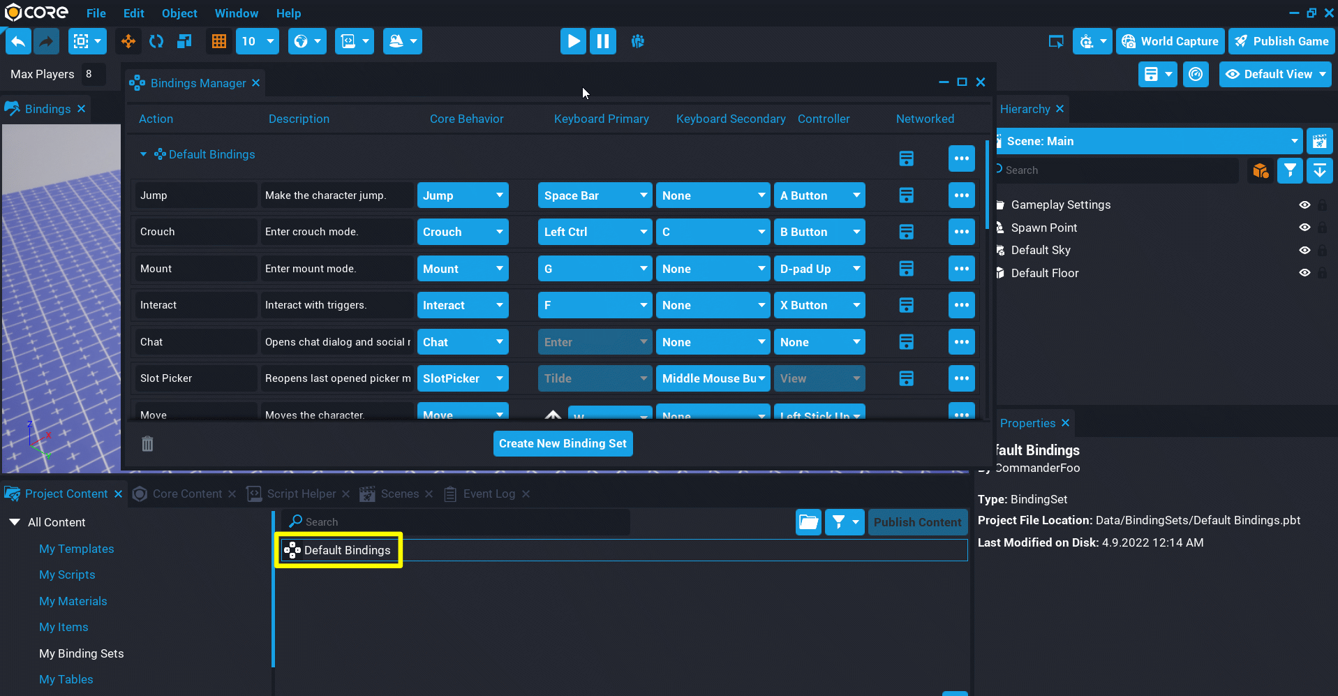 Open up the Bindings Manager window from the Window menu, or by double clicking on the Default Binding set in My Binding Sets found in the Project Content window.