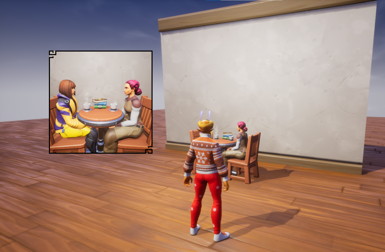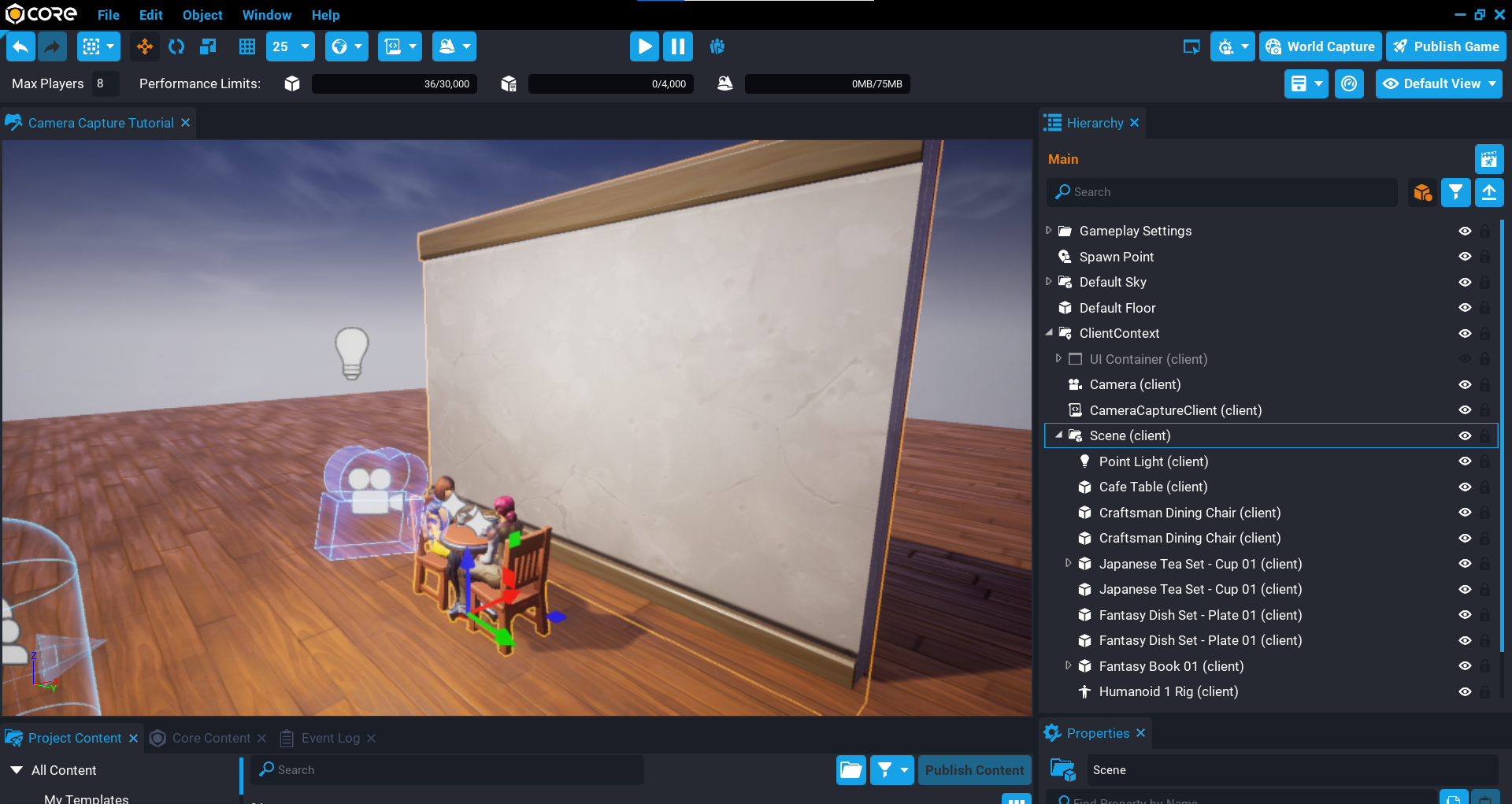 Create a scene by adding objects from Core Content that will be used in the camera capture. Make sure to position the camera so it looks at the scene. Getting the camera in the right position can be trial and error, so play the game often to see what is being captured until you have the camera pointing where you want.