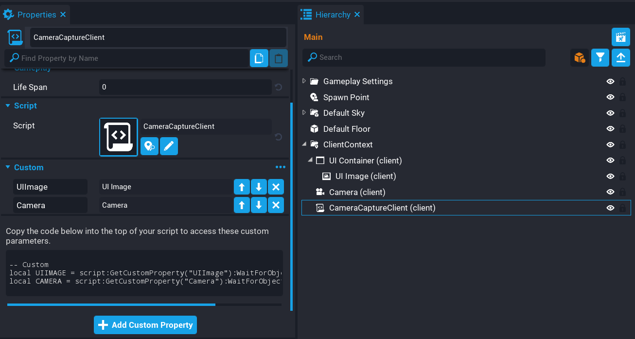 - Add the Camera in the Hierarchy to the CameraCaptureScript as a Custom Property.