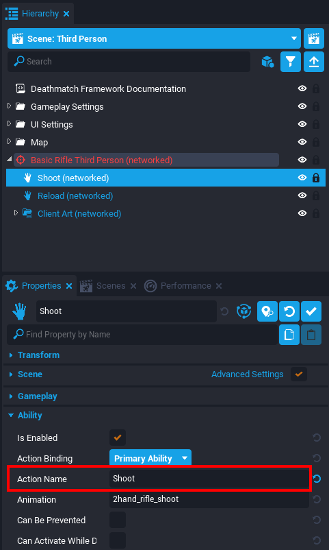 Select the Ability object and open the Properties window. Set the Action Name property to the same action name used when the binding was created.