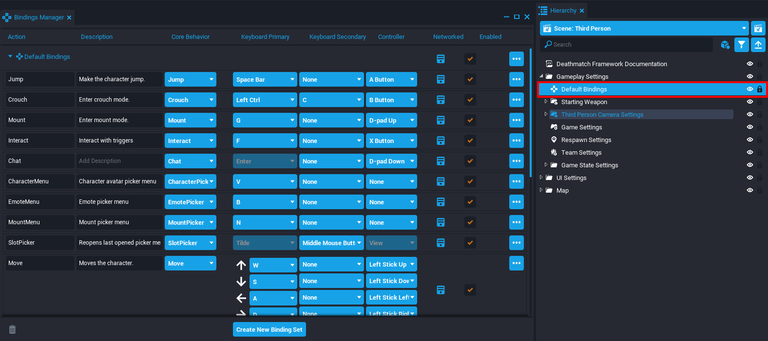 A Binding Set is a set of actions a creator has defined for the game. Each action can be given multiple bindings for keyboards, controllers, and mobile devices. This is incredibly useful to make a player's actions work across multiple devices.