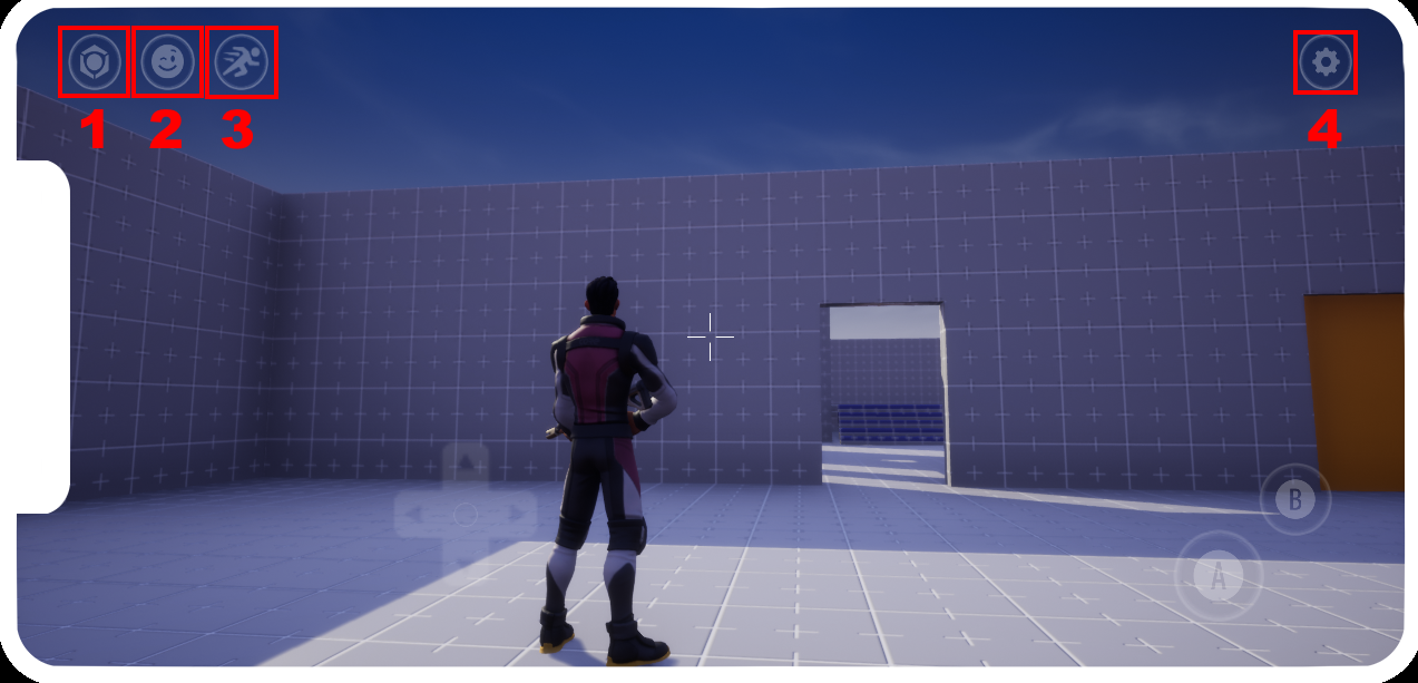At the top of the device preview, there are four default buttons. Going from left to right, these buttons will close the current game, open the emote window, open the mount window, and open the settings window.