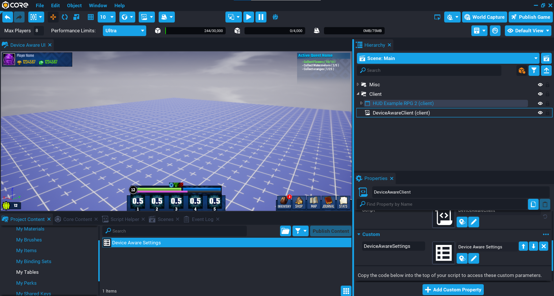 Open up the DeviceAwareClient script and add a reference to the data table custom property. This data table will be required in the script using the require function.