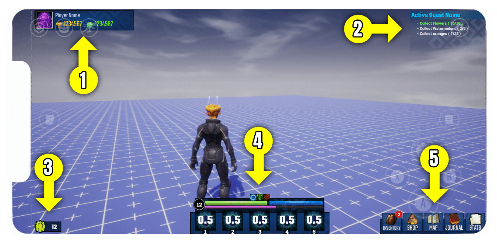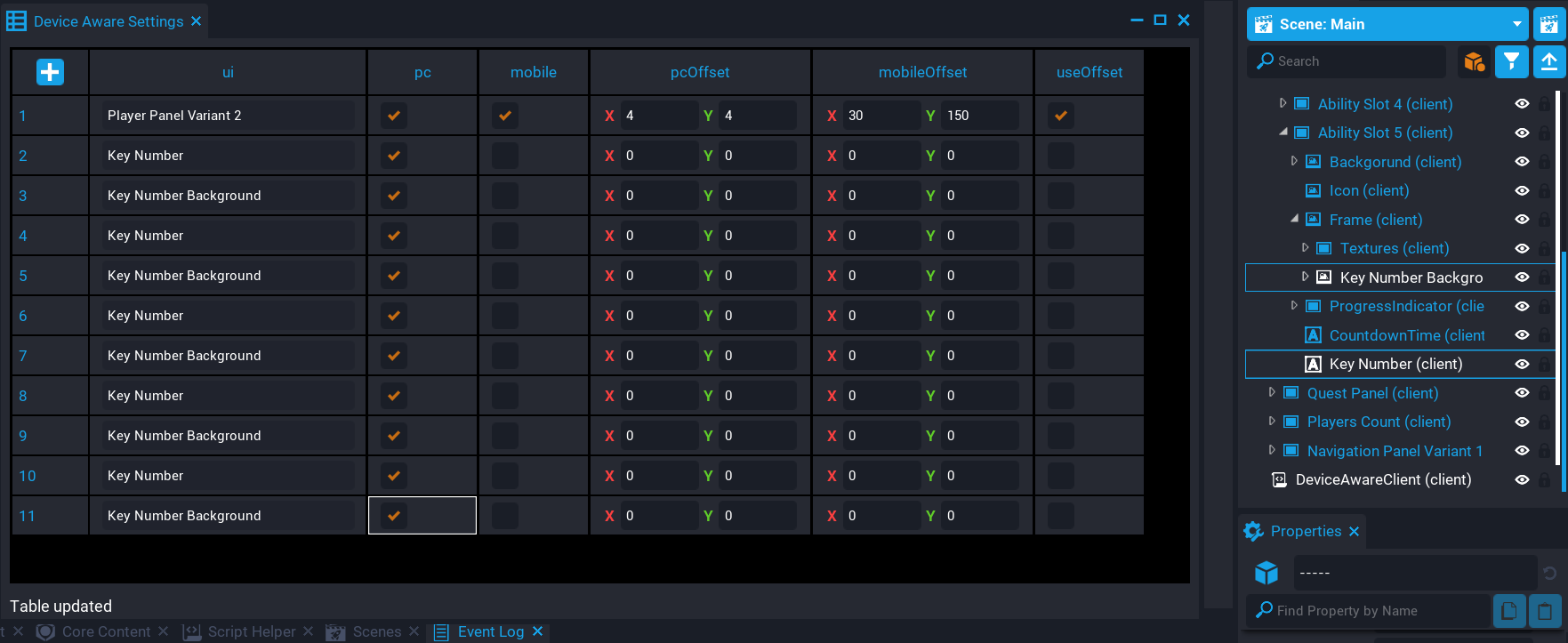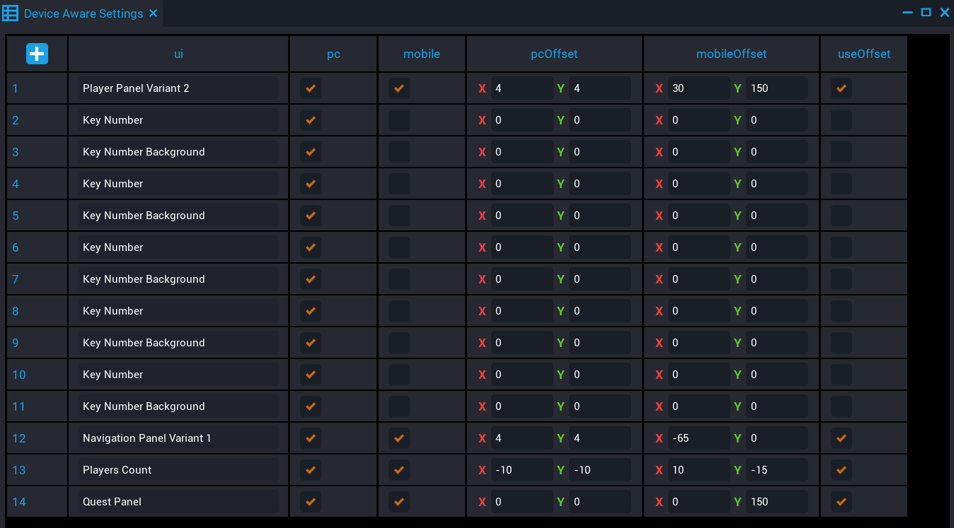 Add a new row to the data table. This row will focus on the player panel that appears top left of the screen. This panel needs to be displayed on PC and Mobile devices and also be moved down in the Y position when the mobile buttons are displayed for Touch input.
