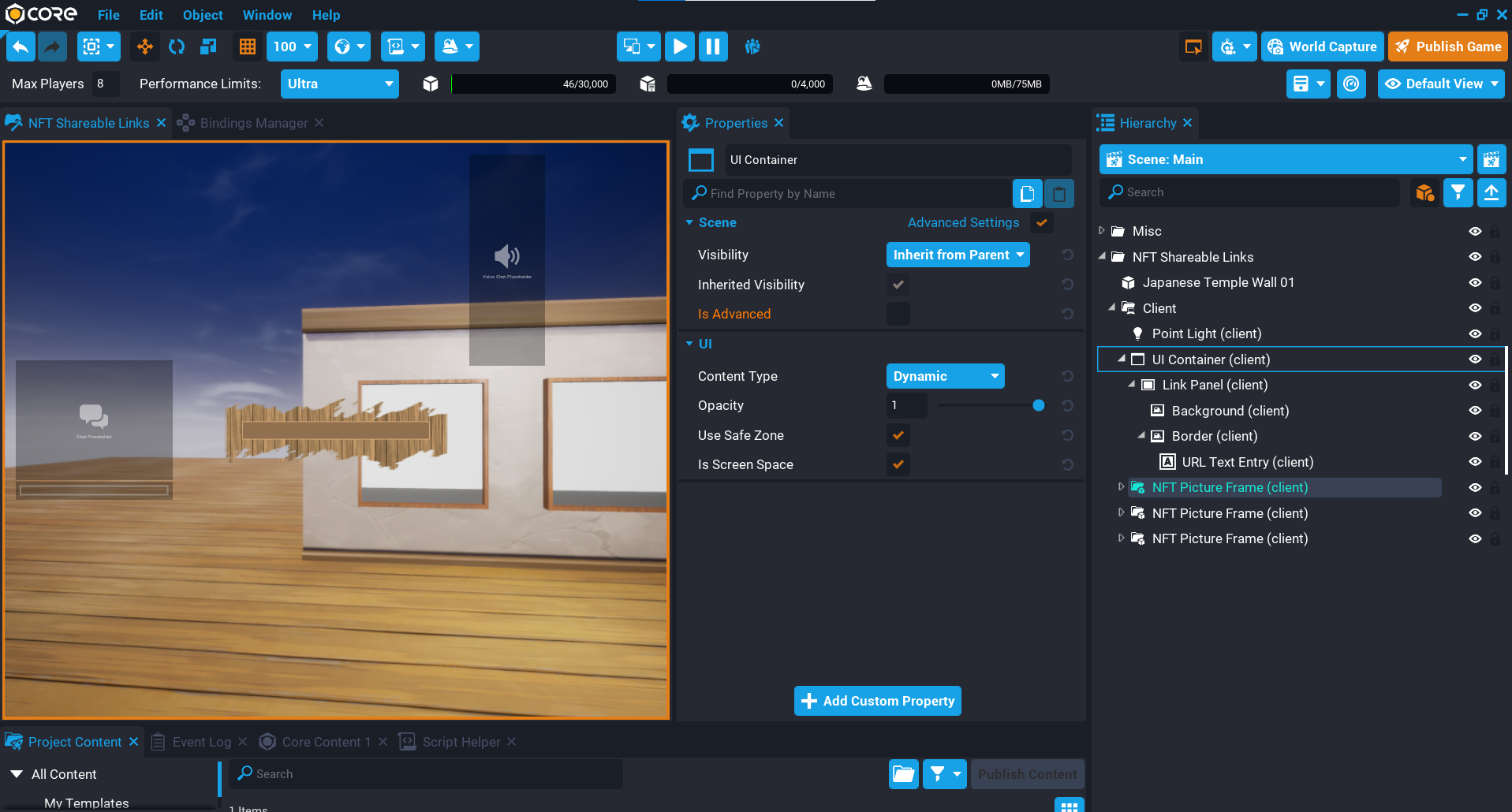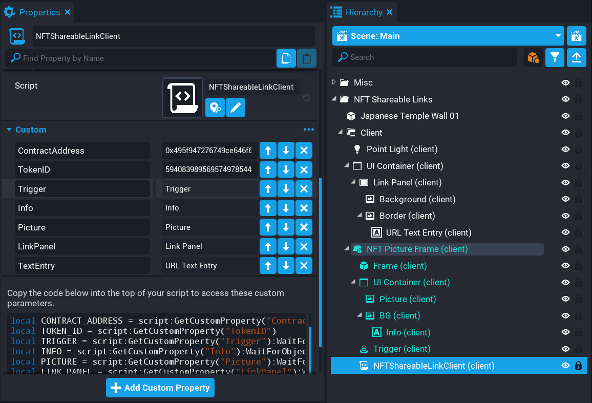 Test the game by entering a contract address and token ID into the custom properties on the NFTShareableLinkClient script. After a few seconds, an NFT image should load, along with the name. The trigger will then become interactable, which will open up the UI to copy the URL.