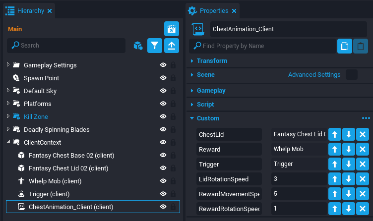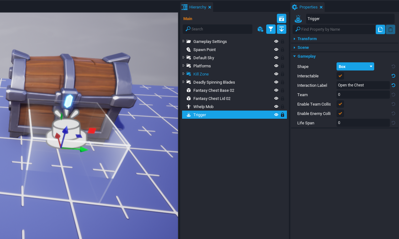 You may have noticed the player can walk through the chest because all the objects are in Client Context. This can be fixed by adding an invisible cube in Default Context to implement collision with the chest.