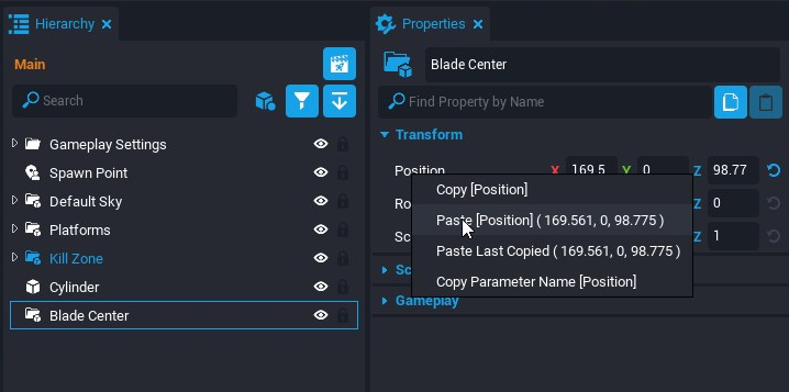 - In the Properties window, right click the Position property and select Copy [Position].