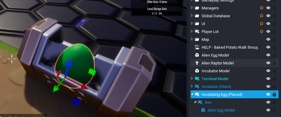 The Alien Egg is an item that will start in the player's inventory. It will need three templates of the visual geometry for how it looks in different places: