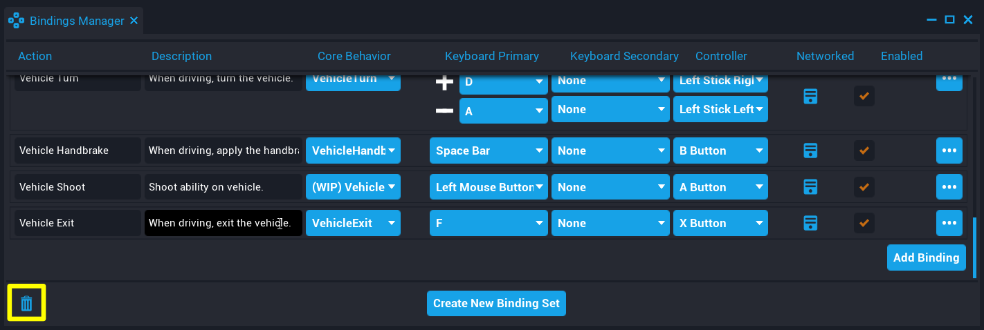When creating a binding, a Core Behavior needs to be selected so that the Binding Set knows which action to perform when the binding is triggered. When a Core Behavior is selected, the binding will get auto-filled with the default Core values for the keyboard and controller inputs.