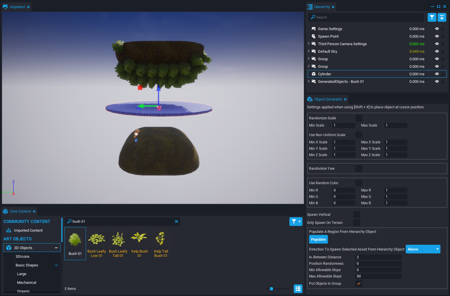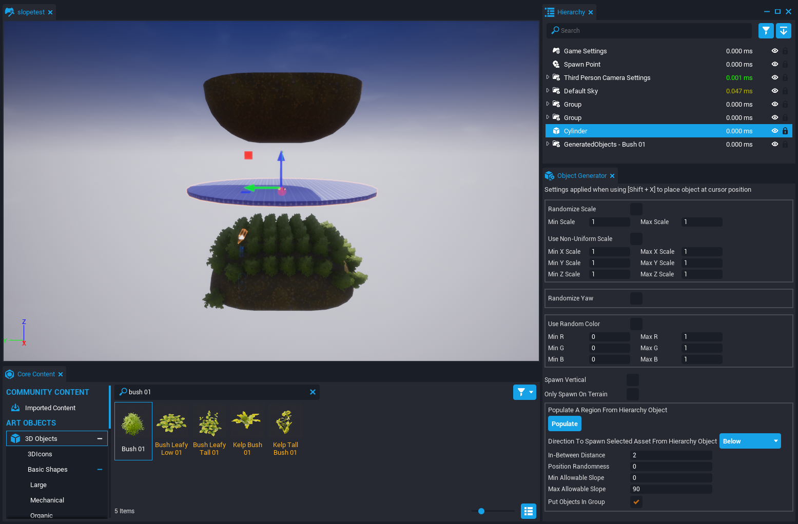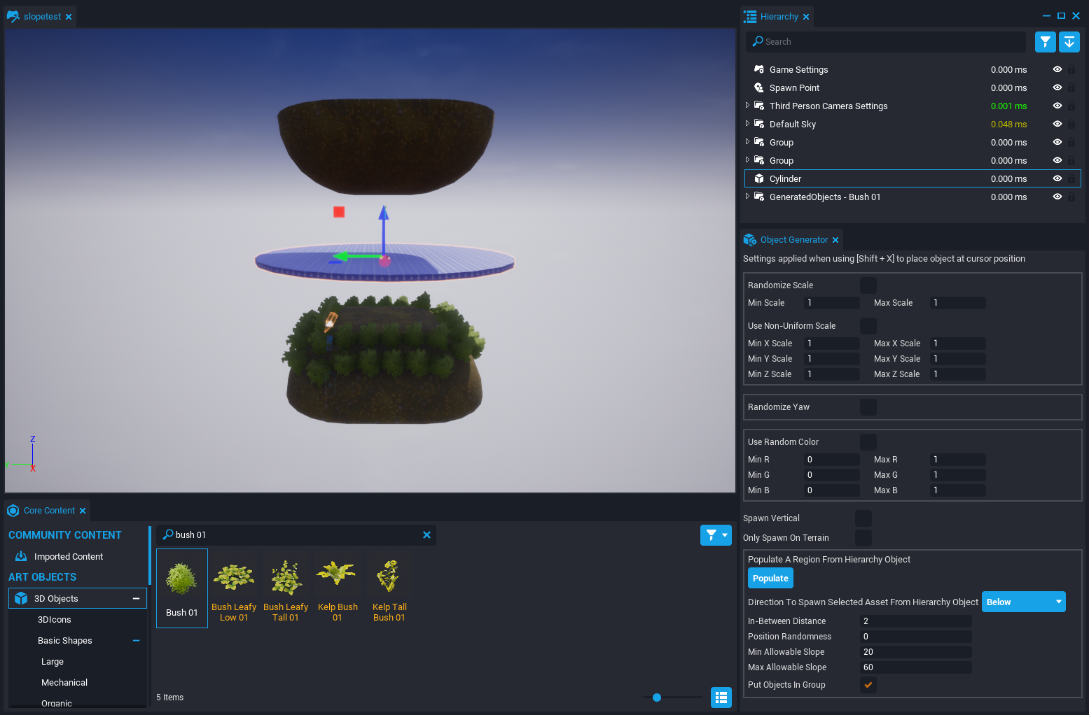 You can also spawn individual objects using the Object Generator's settings by placing your cursor in the scene and pressing Shift+X with an object selected in the Core Content tab. The object will spawn under your cursor. This allows you finer control over an object's placement without having to worry about randomizing its rotation, scale, or color.