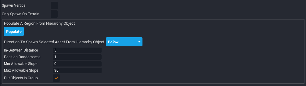 Leave Spawn Vertical unchecked if you want your objects to spawn aligned to the terrain. It's best to leave Spawn Vertical unchecked for organic things like plants and trees.