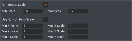 Check Use Non-Uniform Scale if you would like to further fine tune the scale of your objects. You can set the Min and Max Scale for each of an object's axis (X, Y, and Z).